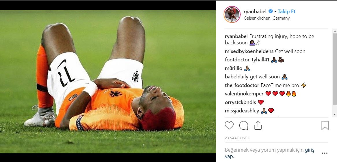 Babel, milli maçtaki sakatlığıyla ilgili bir paylaşımda bulundu. Hollandalı oyuncu sosyal medya hesabından açıklama yaptı. Tecrübeli futbolcu, yaptığı paylaşımda "Sinir bozucu bir sakatlık. Umarım en kısa sürede geri dönerim" ifadelerini kullandı.