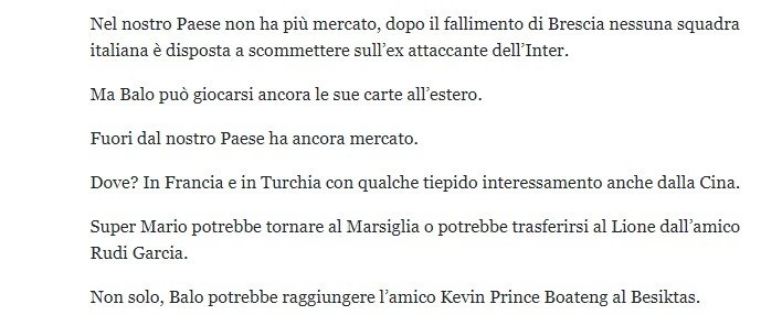 "Süper Mario'nun geleceği ne mi olacak? İtalya'da olmayacağı kesin. Ülkemizde artık bir piyasası yok. Brescia'daki kötü gidişten sonra hiçbir İtalyan takımı onu alarak bir kumar oynamak istemiyor.