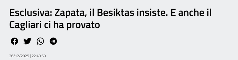 İtalyan gazeteci Alfredo Pedulla haberinde Beşiktaş'ın, 8 Aralık 2025 tarihinde Torino'nun sahasında Milan ile oynadığı ve Zapata'nın da 1 gol attığı maça scout gönderdiğini yazdı.