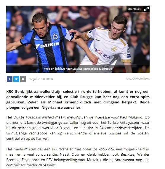 Belçika basınında yer alan habere göre Antalyaspor'un 20 yaşındaki hücumcusu Mukairu için Türkiye dahil olmak üzere Avrupa'nın dev kulüplerinden ilgi var.