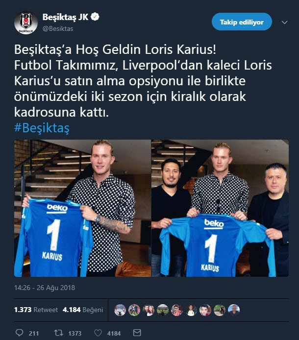Beşiktaş, sosyal medya hesabından yaptığı duyuruda; "Beşiktaş'a hoş geldin Loris Karius! Futbol takımımız, Liverpool'dan kaleci Loris Karius'u satın alma opsiyonu ile birlikte önümüzdeki iki sezon için kiralık olarak kadrosuna kattı." açıklamasına yer verildi.