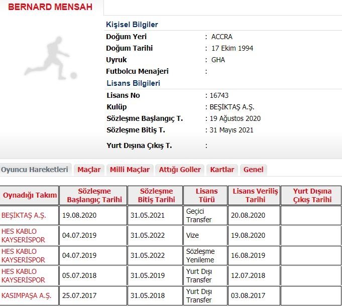 Beşiktaş, Süper Lig ekibi Hes Kablo Kayserispor'dan kiraladığı Ganalı orta saha oyuncusu Bernard Mensah'ın lisansı çıktı. 25 yaşındaki futbolcunun, Şampiyonlar Ligi ön elemesinde PAOK'la oynanacak maçta forma giyebileceği ifade ediliyor.