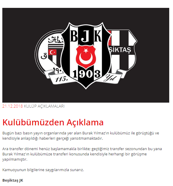 "Burak Yılmaz'ın kulübümüz ile görüştüğü ve kendisiyle anlaşıldığı haberleri gerçeği yansıtmamaktadır. Geçtiğimiz transfer sezonundan bu yana Burak Yılmaz'ın kulübümüze transferi konusunda kendisiyle herhangi bir görüşme yapılmamıştır."