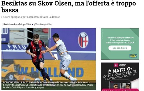 İtalyan kaynaklardan edinilen bilgilere göre Beşiktaş, şu anda Bologna'da forma giyen Skov Olsen'e resmi teklif götürdü.