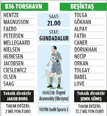 Beşiktaş, Avrupa Ligi'nde ilk maçına bugün çıkıyor. Rakip Faroe Adaları ekibi B36 Torshavn. Siyah- beyazlıların, Gundadalur Stadı'ndaki mücadelesi 21.00'de başlayacak. Karşılaşmayı beIN SPORTS 1 naklen olarak ekranlara taşıyacak. Kartal zayıf rakibi karşısında ilk maçta avantaj arayacak. Alacağı olası galibiyetle Şenol Güneş ve öğrencileri turu ceplerine koymak istiyor. UEFA Avrupa Ligi, 2. ön eleme turunda Kartal'ın B36 Torshavn ile oynayacağı mücadeleyi Ukrayna Futbol Federasyonu'ndan Yevhen Aranovskiy yönetecek. Bu mücadelenin rövanşı 2 Ağustos'ta oynanacak. Temsilcimiz Beşiktaş'ın turu geçmesi halinde olası rakibi de belli. Kartal bu durumda LASK-Lillestrom eşleşmesinin galibiyle oynayacak. Bu maçlar, 9 ve 16 Ağustos'ta olacak.