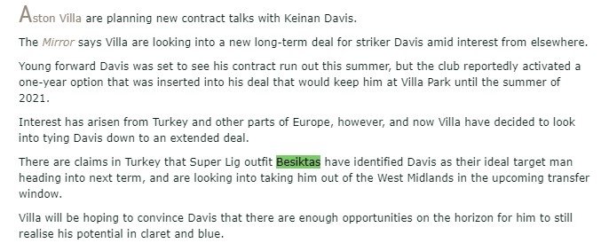 "Aston Villa, Keinan Davis ile yeni sözleşme imzalamak için görüşme yapıyor. Mirror'un aktardığı bilgilere göre Davis için uzun vadeli bir kontrat öneriliyor.