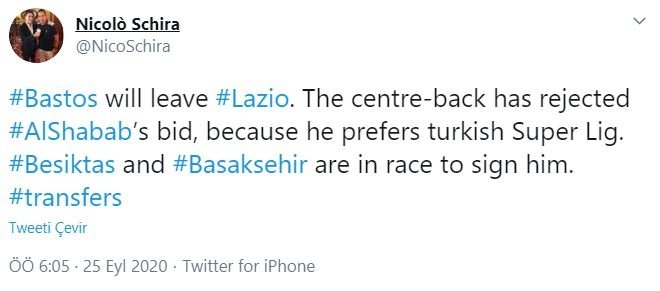Transfer çalışmalarını sürdüren Medipol Başakşehir ve Beşiktaş, gündemine Lazio forması giyen 29 yaşındaki defans oyuncusu Bastos'u almıştı. İki ekibin bir süredir ilgilendiği Angolalı stoperin, Süper Lig'de oynamak istediği ifade edildi.