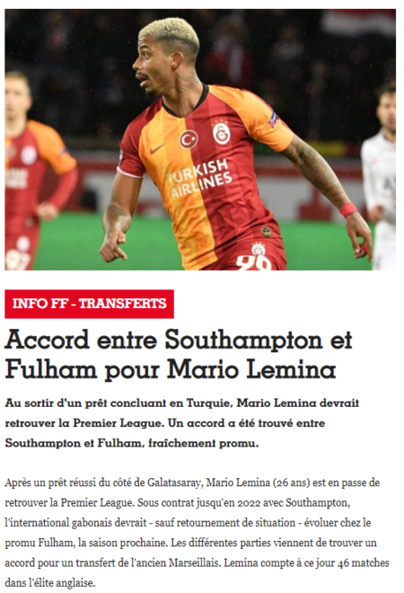 Bonservisi Southampton'da bulunan Lemina'nın, Fulham'a kiralık olarak gönderileceği belirtildi.