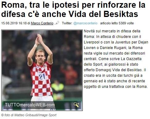 La Gazzetta dello Sport'ta yer alan habere göre başkent ekibi, Liverpool forması giyen Hırvat futbolcu Dejan Lovren transferinde başarılı olamayınca rotasını Beşiktaşlı Domagoj Vida'ya çevirdi.