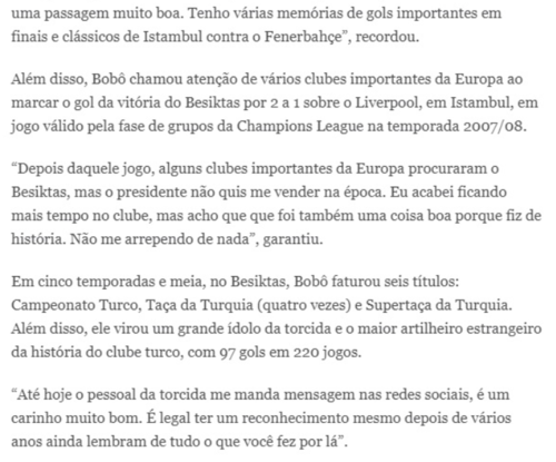 Süper Lig'de sırasıyla Beşiktaş, Kayserispor ve Alanyaspor'da forma giyen Bobo, ESPN Brezilya'ya Türkiye'de geçirdiği günleri anlattı.