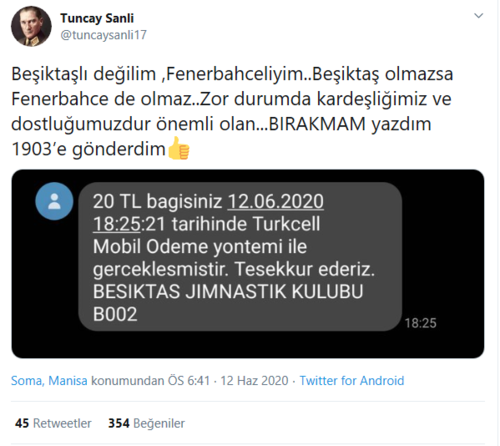 Tuncay Şanlı sosyal medya hesabından yaptığı paylaşımda, "Beşiktaşlı değilim ,Fenerbahçeliyim..Beşiktaş olmazsa Fenerbahçe de olmaz..Zor durumda kardeşliğimiz ve dostluğumuzdur önemli olan...BIRAKMAM yazdım 1903'e gönderdim" ifadesini kullandı.