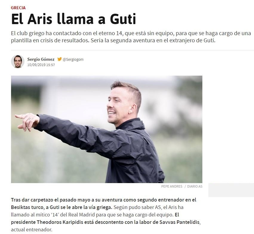 AS'ta yer alan habere göre Yunanistan Ligi takımlarından Aris'te başkan Theodoros Karipidis mevcut teknik direktör Savvas Pantelidis'in performansından memnun değil ve takımın başına Guti'yi getirmek istiyor.