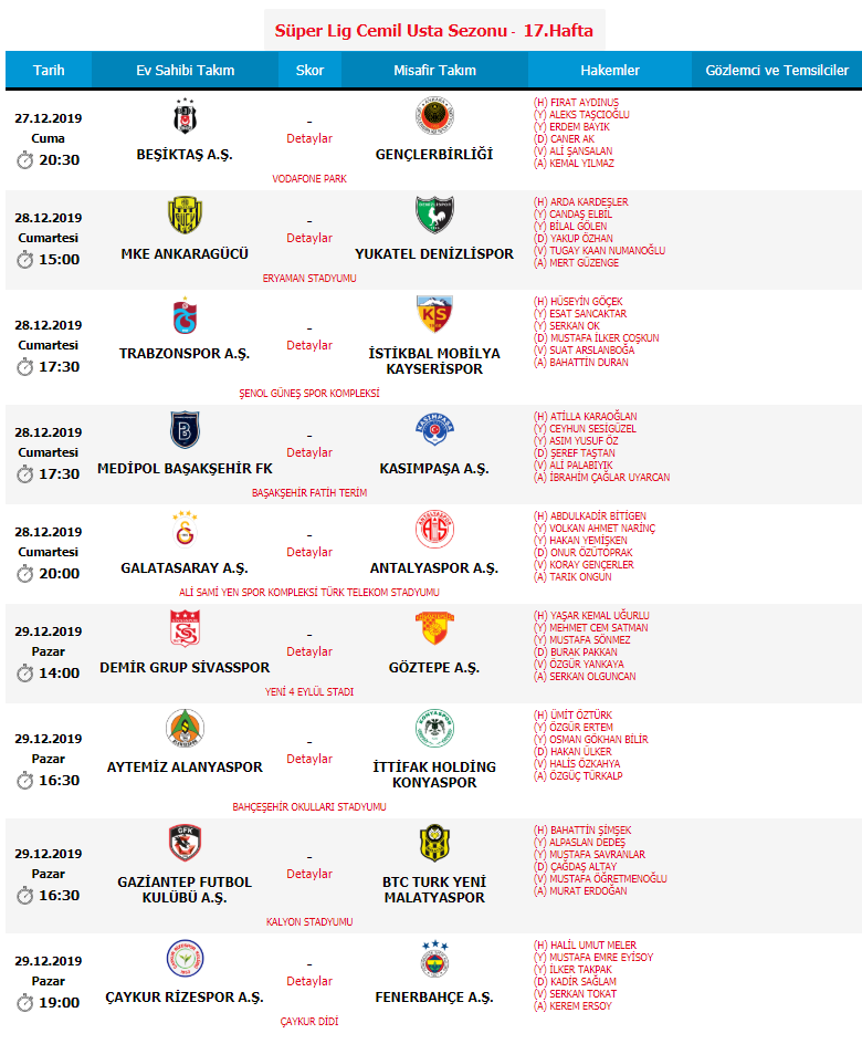Süper Lig'in 17. haftası cuma akşamı oynanacak Beşiktaş - Gençlerbirliği karşılaşması ile başlayacak. İlk yarının son hafta maçlarını yönetecek hakemler de aç