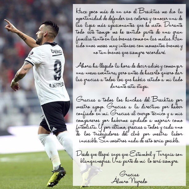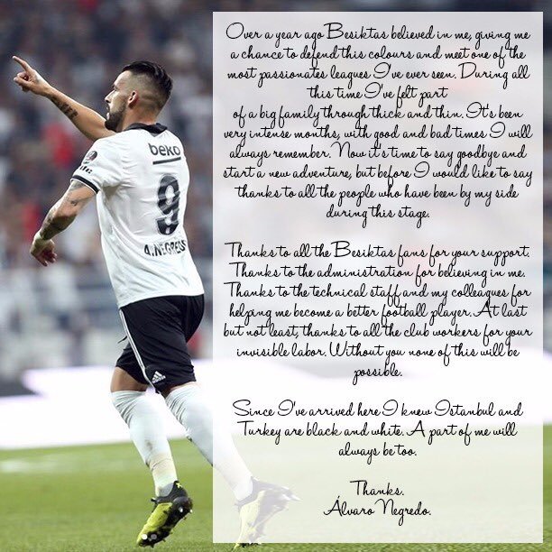 Beşiktaş'tan ayrılıp Birleşik Arap Emirlikleri takımlarından Al Nasr'a transfer olan Alvaro Negredo, sosyal medya hesabından taraftara veda mesajı yayınladı. Negredo mesajında şu ifadelere yer verdi;