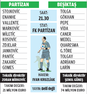 Avrupa'daki 209. maçına çıkacak olan Beşiktaş'ın rakibi Sırbistan'ın en köklü takımlarından Partizan. Gruplara kalma mücadelesi verilecek olan ilk maçta Beşiktaş tur için avantajlı bir skorla dönmek istiyor. Partizan - Beşiktaş maçını Türkiye'den yayınlayacak kanal henüz belli değil. Bu maçı yayınlayacak yabancı kanallar ise şöyle;
