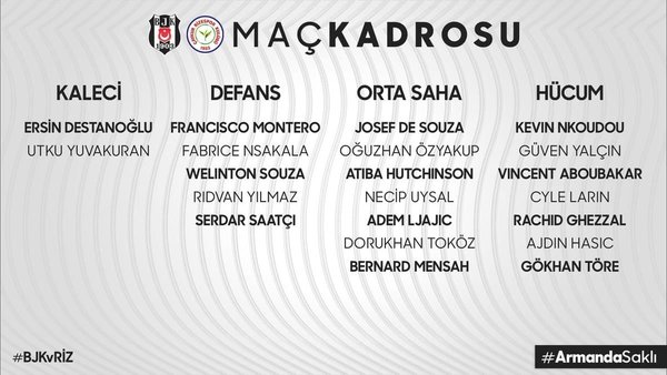 Siyah-beyazlı kulüpten yapılan açıklamaya göre, sakatlıkları nedeniyle uzun süredir takımdan ayrı kalan Adem Ljajic ile Gökhan Töre de kadroya dahil edilirken, Domagoj Vida, Valentin Rosier ve Atakan Üner kadroda yer almadı.
