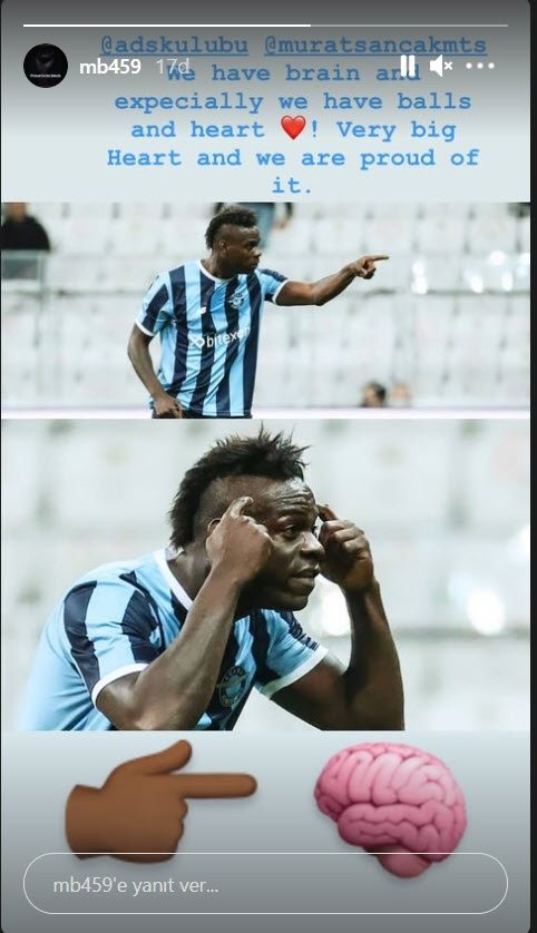 Mario Balotelli'nin Beşiktaş maçı sonrası yaptığı paylaşım olay oldu. 31 yaşındaki futbolcu sosyal medya hesabından paylaştığı fotoğrafa, "Bizim beynimiz ve özellikle ta..... ile kalbimiz var. Bununla gurur duyuyoruz." notunu düştü.