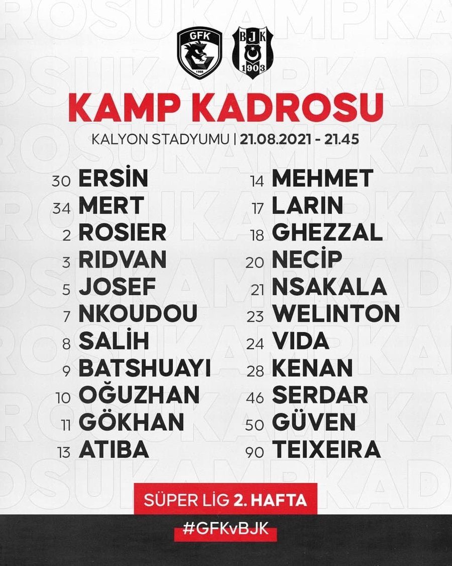 Süper Lig'in ikinci haftasında yarın Gaziantep'e konuk olacak Beşiktaş'ın kamp kadrosu belli oldu. Siyah-beyazlı takımın yeni transferleri Alex Teixeira, Michy Batshuayi ve Mert Günok da kamp kadrosunda yer aldı.