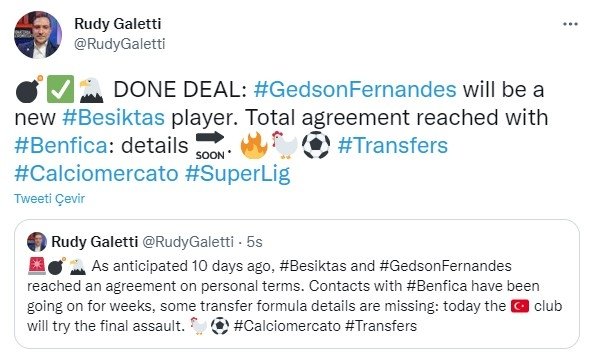 İtalyan gazeteci Rudy Galetti'nin haberine göre Beşiktaş, Galatasaray'ın de peşinde olduğu Gedson Fernandes transferinde mutlu sona ulaştı.