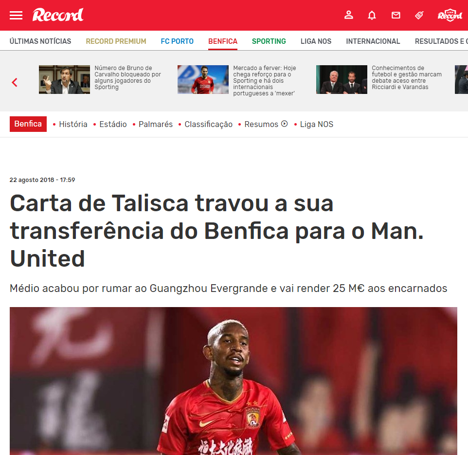 Portekiz gazetesi Record'da yer alan habere göre Guangzhou Evergrande, şu anda kiralık olarak takımda yer alan Talisca'yı 25 milyon Euro karşılığında bonservisiyle birlikte alıyor. 24 yaşındaki Talisca, Çin'de forma giydiği 7 maçta 9 gol atıp 4 de asist yaptı.