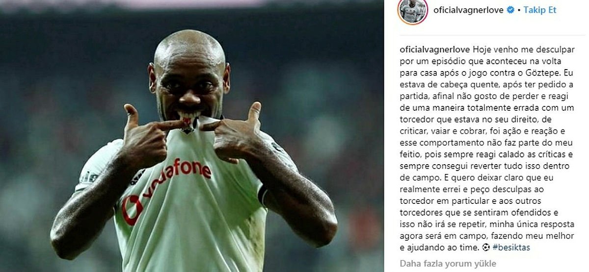 Beşiktaş'ın Göztepe maçı sonrası havaalanında kendisine 'Go Home' diyen taraftara orta parmak gösteren Vagner Love özür diledi. Instagram hesabından özür dileyen Brezilyalı "O anlarda kızgındım, haklı bir şekilde eleştiride bulunan taraftara çok yanlış reaksiyon verdim. Kaybetmekten nefret ederim, o yüzden sinirliydim. O anki davranışım asla benim karakterimi yansıtmıyor. Yaptığım hatadan dolayı tekrar özür diliyorum, tekrarı olmayacak" dedi.