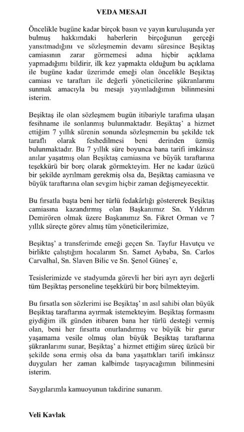 Beşiktaş ile olan sözleşmem bugün itibariyle tarafıma ulaşan fesihname ile sonlanmış bulunmaktadır. Beşiktaş' a hizmet ettiğim 7 yıllık sürenin sonunda sözleşmemin bu şekilde tek taraflı olarak feshedilmesi beni derinden üzmüş bulunmaktadır. Bu 7 yıllık süre boyunca bana tarifi imkânsız anılar yaşatmış olan Beşiktaş camiasına ve büyük tarattarına teşekkürü bir borç olarak görınekteyim. Her ne kadar üzücü bir şekilde ayrılmam gerekmiş olsa da, Beşiktaş camiasına ve büyük taraftarına olan sevgim hiçbir zaman değişmeyecektir. Bu fırsatla başta beni her türlü fedakârlığı göstererek Beşiktaş camiasına kazandırmış olan Başkanımız Sn. Yıldırım Demirören olmak üzere Başkanımız Sn. Fikret Orman ve 7 yıllık süreçte görev almış tüm yöneticilerimize,